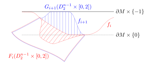 非負値連続関数 $h : \Int D_{3}^{n - 1}\to [0, 1]$ を\[h(x) = \left\{\begin{array}{ll}1 & (|x|\leq 1) \\2 - |x| & (1\leq |x|\leq 2) \\0 & (2\leq |x|)\end{array}\right.\]により定義し、同一視 $h_{i + 1} : W_{i + 1}\times [0, +\infty)\subset M$, $\varphi_{i + 1} : W_{i + 1}\cong \Int D_{3}^{n - 1}$ のもとで埋め込み $G_{i + 1} : D_{2}^{n - 1}\times [0, 2]\to M^{+}$ を\[G_{i + 1}(q, s) = \left\{\begin{array}{ll}(q, g_{i}(q) + s - h(q)(g_{i}(q) + 1)) & (0\leq s\leq h(q)(g_{i}(q) + 1)) \\F_{i}(q, 2\tfrac{s - h(q)(g_{i}(q) + 1)}{2 - h(q)(g_{i}(q) + 1)}) & (h(q)(g_{i}(q) + 1)\leq s\leq 2)\end{array}\right.\]と定めます。$G_{i + 1}$ は $(\partial D_{2}^{n - 1}\times [0, 2])\cup (D_{2}^{n - 1}\times \{2\})$ において $F_{i}$ に一致するので、$D_{2}^{n - 1}\times [0, 2]$ 以外では $F_{i}$ に等しいように拡張して連続写像 $F_{i + 1} : M\to M^{+}$ を取ります。この $F_{i + 1}$ が埋め込みであることと条件(i)から(iv)を満たすことは容易です。