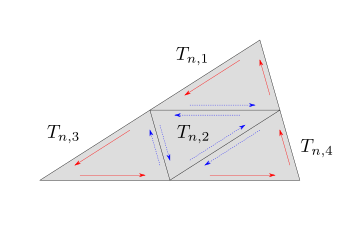 以下の手続きにより三角形の列 $\{T_{n}\}_{n\in\N}$ を取ります。