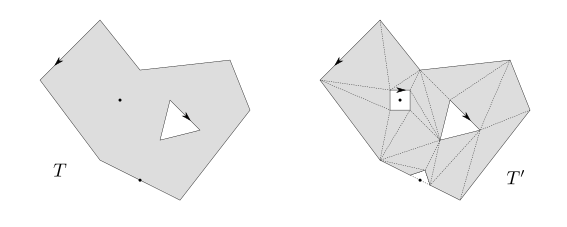 まず、与えられた多角形 $T$ から複素微分不可能な点の近傍を除いた多角形 $T'$ を取ります。$T'$ をいくつかの三角形 $T'_{1}, \dots, T'_{n}$ に分割し地味にここが大変。多角形の頂点が全て格子点になる格子を取り $($正方格子である必要はない$)$、その格子に従って多角形を分割すると、ひとつひとつは凸多角形になるので(格子の一つの長方形の中で複数になることはある)、あとはそれらを三角形に分割すればよいです。、各 $T'_{n}$ に対して命題4.3.67を適用することで\[\int_{\partial T'}f(z)dz = \sum_{k = 1}^{n}\int_{\partial T'_{k}}f(z)dz = 0\]が分かります。