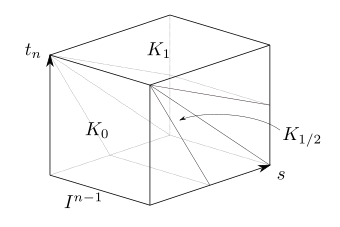 各 $[v]\in \Ker j_{*}$ に対し、$j\circ v$ は $C((I^{n}, \partial I^{n}, J^{n - 1}), (X, A, x_{0}))$ において定値写像 $e_{0}$ にhomotopicであるので $j\circ v$ を $e_{x_{0}}$ につなぐhomotopy $H : I^{n}\times I\to X$ を取り、homotopy $K : I^{n}\times I\to X$ を\[K : I^{n}\times I\to X : (t_{1}, \dots, t_{n}, s)\mapsto \left\{\begin{array}{ll}H(t_{1}, \dots, t_{n - 1}, t_{n}, 2s(1 - t_{n})) & (0\leq s\leq \tfrac{1}{2})\\H(t_{1}, \dots, t_{n - 1}, 1 - 2(1 - s)(1 - t_{n}), 1 - t_{n}) & (\tfrac{1}{2}\leq s\leq 1)\end{array}\right.\]により定めれば $K_{0} = v$, $K_{1}\in C((I^{n}, \partial I^{n}), (A, x_{0}))$ であり式は追わずに図3.1.4を見たほうがいいです。$H$ は $s = 0$ および $t_{n} = 1$ 以外の面と各辺に対応する部分を基点 $x_{0}$ に移し、$s = 0$ の面は $X$ に、$t_{n} = 1$ の面は $A$ に移します。そして、各 $K_{s}$ は $(t_{n}, s) = (1, 0)$ で表される辺を含む平面による切断面への $H$ の制限となるように定義されています。、$u = K_{1}$ に対して $i_{*}([u]) = [i\circ u] = [v]$ です。従って、$\Ker j_{*}\subset \Img i_{*}$ です。