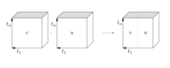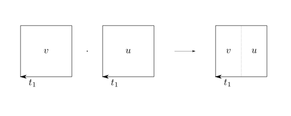 $n$ 次元単位超立方体 $I^{n}$ から基点付き空間 $(X, x_{0})$ への連続写像であって境界 $\partial I^{n}$ を基点 $x_{0}$ に移すもの $u, v\in C((I^{n}, \partial I^{n}), (X, x_{0}))$ に対する積 $v\cdot u\in C((I^{n}, \partial I^{n}), (X, x_{0}))$ を第 $1$ 成分の向きにつなぎ合わせた\[(v\cdot u)(t_{1}, \dots, t_{n}) = \left\{\begin{array}{ll}u(2t_{1}, t_{2}, \dots, t_{n}) & (0 \leq t_{1}\leq \tfrac{1}{2}) \\v(2t_{1} - 1, t_{2}, \dots, t_{n}) & (\tfrac{1}{2} \leq t_{1}\leq 1)\end{array}\right.\]により定義しますこれを $u\cdot v$ と定めるテキストも多いです。。