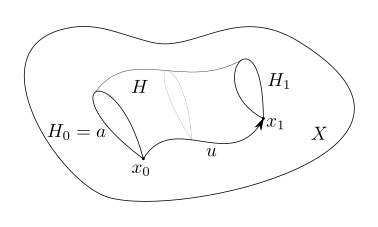 $P(X; A, B)$ のhomotopy集合を $\Pi(X; A, B)$ により表すことにします。$\Pi(X; x_{0}, x_{1})$ の元は道のhomotopy類と呼ばれます。上記の道の積はhomotopy集合についての積\[\Pi(X; x_{0}, x_{1})\times \Pi(X; x_{1}, x_{2})\to \Pi(X; x_{0}, x_{2}) : ([u], [v])\mapsto [v]\cdot [u] := [v\cdot u]\]を誘導します。
